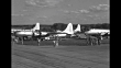 Thunderbirds (F-84 Thunderjet) precision flight over field / pan air craft on tarmac, people walking around them / VS Jimmy Stewart stoops to sign autographs for circle of children / ext a hangar General Curtis E LeMay, US Strategic Air Command, and Lt General James Doolittle talking as Stewart walks up to shake hands / CU pan as they talk