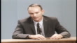 Tight close up on Buzz Aldrin, who is sitting at a table with his hands folded atop it. He wears a dark suit, red tie, and a pin on his lapel. In response to a question, he says: "Well now these interesting pebbles, rocks, boulders, whatever it was that was in the Surveyor photographs. If we could only go out there and examine that a little closer and take a picture from another angle, get some stereo...this I think begins to say why, at a first glance, man could do something more by being there on foot than being, then always looking at things remotely." Camera then pans to Michael Collins, sitting to Aldrin's right (camera left), as he begins to add to Aldrin's answer. Collins wears a grey suit and dark tie. He says: "I'd like to say also, I think to stop at this stage of the game would be equivalent to having Columbus sail up to 60 miles of the shoreline and then turn back to Queen Isabella and go on home." He cracks a smile after this remark, and the shot ends.