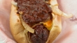 Tight shots of bacon wrapped chili dog.