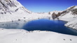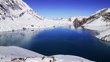 Tilicho Lake glows under the sunlight, surrounded by white slopes and rocky peaks. - 4K stock video