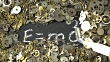 Close up 4K video of heap of clockworks covering the text 'E=mc2' on blackboard.Tweezers are used to uncover text which is written with chalk on blackboard.