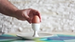 Human hand with spoon is breaking eggshell.