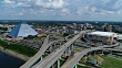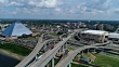 Footage of Memphis, TN Interstate I-40 coming into Memphis, TN with views of Bass Pro Pyramid, Cook Convention Center.