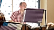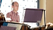 A male timpani player, beats his kettledrums in an orchestral rehearsal.