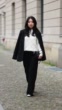 BERLIN, GERMANY - DECEMBER 4: (SLOW-MO) TingTing Lai wears white knitted jumper, black blazer, flared pants, white pointed ankle boots, black bag on December 4, 2022 in Berlin, Germany. (Footage by Christian Vierig/Getty Images)