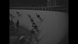 Title "Chicago" superimposed over Chicago Stadium racetrack as six-day bicycle race is in progress / racers on track / looking down on racers / VS racers coming down track and rounding curve / scoreboard listing two-man teams, man on ladder updating numbers / CU Canadian cyclist William "Torchy" Peden eating meal on a tray / CU tray of food with Peden's hands wearing cycling gloves cutting meat / CU Peden eating / pan out from tray to Peden eating / German cyclist Heinz Vopel on bed as trainer rubs his leg / racers on track / Vopel / racers on track rounding curve / racers coming down track / MS woman asleep covered with blanket lying across stadium seats, two people eating popcorn next to her / three women laughing and eating popcorn / camera follows cyclist on track / racers on track