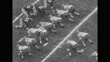 Title "Cotton Bowl - T.C.U. vs Syracuse" superimposed over glass bowl filled with cotton balls / teams onto field running between both school's bands / TCU #46 Charles Curtis passes to #85 John Nikkel / next he passes to #22 Jimmy Shofner who is in the end zone for a touchdown / crowd sits down / VS Syracuse #44 James Brown makes touchdown in three plays / crowd in stands / Curtis finds no receiver so runs ball 15 yards / he keeps ball second time and runs in for touchdown / crowd cheers / Syracuse #16 James Ridlon passes to #88 Richard Lasse / #23 Charles Zimmerman passes to Ridlon who scores / fans in stands jumping / scoreboard / fans and players on the field.