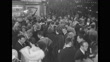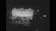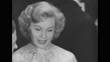 Title "Gala Hollywood premiere" superimposed over crowd on sidewalk at night / lit up marquee of Wilshire Theater with words "Red Garters" displayed on it, crowd in front of theater and in foreground across street / close shot of klieg light / crowd on sidewalk in front of theater / two women in dance costumes pulling garters down their legs / same two women throwing garters at people / actress Marla English arrives in surrey pulled by horse / model turned actress Joanne Gilbert standing in middle of crowd between two women who have thrown their garters to people in crowd / VS actors and actresses standing with man at microphones and talking including: Pat Crowley, Jack Carson, movie's director George Marshall, Corinne Calvet, Rhonda Fleming and Zsa Zsa Gabor with cutaways of crowd/ photographers and cameramen taking pictures / actor Guy Mitchell standing at microphones posing for photo opportunity next to Los Angeles Sheriff Eugene W. Biscailuz / crowd on sidewalk / lit up marquee of theater, crowd on sidewalk in front of theater