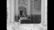 Title "General Arnold makes his last flight" superimposed over airplane carrying Gen. Henry "Hap" Arnold's body taxiing on tarmac at airport, people and cars nearby / USAF honor guard standing on tarmac saluting with rifles / military personnel carrying Arnold's casket draped with US flag away from plane between rows of honor guard / wider shot of plane, honor guard and hearse / shot of exterior of National Cathedral where Arnold's body lies in state, US flag at half mast in front of Cathedral / grille on window inside Cathedral is opened revealing Arnold's body lying in state / two shots of honor guard standing at attention around Arnold's body lying in state / shot from moving vehicle in front of West Point Cadets marching in formation down street in funeral procession / shot of caisson carrying Arnold's casket draped in US flag in funeral procession / horses pulling caisson with casket past Arlington National Cemetery Amphitheater, honor guard standing on steps as it passes by / General Dwight Eisenhower and Secretary of Defense George Marshall walking along passageway in Amphitheater / shot of funeral guests sitting in seats of Amphitheater, US flags hanging overhead / sitting in front row of seats in Amphitheater from left to right Marshall, President Harry Truman, General Hoyt Vandenberg and Secretary of State Dean Acheson / guests sitting in Amphitheater as snow starts falling / two shots of honor guard standing next to casket at top of steps in Amphitheater / Note: film has nitrate deterioration