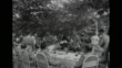 Title "Inside Moscow with Gen. Twining - States US Arms policy" superimposed over wide overhead shot of garden party / guests walking towards party / pan across top officials at party sitting and posing for photo opportunity, Twining fourth from right, Soviet Premier Nikolai Bulganin sixth from right, General Secretary of Communist Party Nikita Khrushchev on left of Bulganin / people sitting at tables and standing around / Bulganin holds up glass as he makes a toast / two shots of people standing for toast / Twining standing at table and speaking / officials sitting and listening / Twining standing and speaking / people standing and drinking / officials sitting in chairs on edge of artificial lake / two shots of Bulganin rowing boat on lake with British Secretary of State for Air Nigel Birch and another man