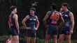 SYDNEY, AUSTRALIA - MARCH 22: Toby Greene, Toby Bedford, Callum M. Brown and Jake Riccardi speak during a break at a Greater Western Sydney Giants AFL training session at Vailo Community Centre on March 22, 2024 in Sydney, Australia. (Footage by Mark Kolbe/Getty Images)