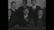 QS title card: "Tokio Navy Arms Group Greets U. S. - Washington - Enroute to London, Spokesman Wakatsuki hails America in his own tongue" / Japanese former prime minister Baron Reijiro Wakatsuki speaks while seated comrades and a woman wearing a kimono listen; the delegation is in Washington to meet with US officials prior to London Naval Conference / MS Wakatsuki in the group as delegate Hiroshi Saito translates the message / Note: exact day not known