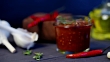 Garlic, red hot chili peppers and potherbs with natural fresh salsa in glass jar on black table. Circle dolly shot
