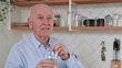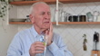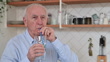 A man drinks a cold drink with ice through a straw and feels severe pain in his teeth due to damage to the tooth enamel. Hold onto the site of pain. He removes a straw and ice cubes from a glass of cold drink.
