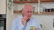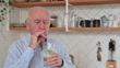 A man drinks a cold drink with ice through a straw and feels severe pain in his teeth due to damage to the tooth enamel. Hold onto the site of pain. He removes a straw and ice cubes from a glass of cold drink.
