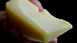 Left hand props up wedge of Swiss cheese as right hand enters with stainless steel cheese slicer and bevels off a slice of cheese against black backdrop in slow motion. The slice then hangs halfway off the block.