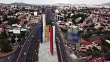 This is an aerial view of the Periferico highway, this area is from Naucalpan in Estado de Mexico, Mexico State, but the city is also part of Mexico city urban area. Directly below we can see the Periferico Highway with its second floor in the middle, we see cars passing, the traffic is moving fast.On the shot, we see the Satelite Towers this monument was built in 1957-1958 designed and built by a team of three people, sculptor Mathias Goeritz, architect Luis Barragan, and painter Jesús Reyes Ferreira.