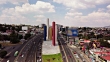 This is an aerial view of the Periferico highway, this area is from Naucalpan in Estado de Mexico, Mexico State, but the city is also part of Mexico city urban area. Directly below we can see the Periferico Highway with its second floor in the middle, we see cars passing, the traffic is moving fast.On the shot, we see the Satelite Towers this monument was built in 1957-1958 designed and built by a team of three people, sculptor Mathias Goeritz, architect Luis Barragan, and painter Jesús Reyes Ferreira.