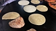 We see a tortilleria working, this is how corn tortillas are made in Mexico, in this image we see a large comal, the comal is large like a barbecue grill, but more like a flat iron heated with fire, the tortillas are made from corn flour and mixed with water and flattened after that they are place in this comal and the flatbread tortilla are made.