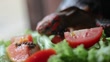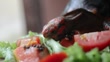 Red-faced tortoise happily eating papaya and vegetables / Chelonoidis carbonaria