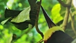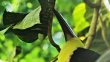 A chestnut mandibled toucan (Ramphastos swainsonii) bites a leaf while sitting in a tree.