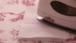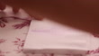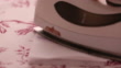 Touching and spilled candle wax in a flowered tablecloth removing wax with ironing paper towel - 4K stock video