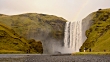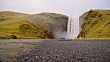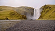 Two slow motion dolly shots of a group of tourists enjoying the view of the spectacular Skogafoss waterfall. Iceland.