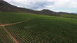Drone shot of a tractor making its way through the vineyards spraying. Farmers spray the vineyards early summer in the Breede River Valley near Cape Town.