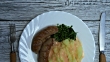 Bangers and mash as known as sausages and mash. Traditional British dish of meat sausage and mashed potatoes served with stewed or steamed green vegetable on white plate. Dolly shot