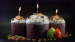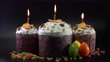 Traditional Easter cakes on black background. Migdal, candied fruits, colorful eggs and raisins, decor. Orthodox treat. candles are burning