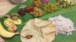 Traditional Sadhya meal served on a banana leaf in Toronto, Ontario, Canada during the Onam Festival on August 28, 2021. Sadhya consists of a variety of traditional vegetarian dishes served on a banana leaf and is common during celebrations and festivals in the Indian state of Kerala. Sadhya means banquet in Malayalam. Onam is a harvest festival and is one of three major annual Hindu celebrations along with Vishu and Thiruvathira observed by Keralites. (Footage by 51³Ô¹ÏÍø Touch Imaging/NurPhoto via Getty Images)