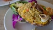 Pineapple curry fried rice served in a hollowed out half pineapple. This popular dish combines sweet pineapple chunks and stir-fried Jasmine rice with garlic, onion, curry powder, cashews, and raisins