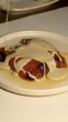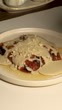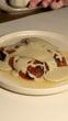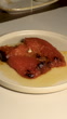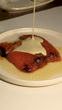 Close-up of traditional Turkish pumpkin dessert being prepared. Tahini is poured over baked pumpkin slices, then crushed walnuts are added on top before serving. A popular sweet dish in Turkish cuisine.