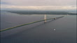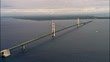 AERIAL Traffic passing over the Mackinac Bridge as lone sailboat approaches it/ Mackinaw City, Michigan - HD stock video