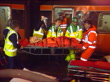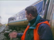Cumbria: Train Crash; ENGLAND, Cumbria, Nr Kirkby StephenRaining lightlyTMS SIDE Two damaged trains at collision point PAN L-R carriages slewed across trackMS SIDE Bogies of Super Sprinter train off tracks as carriage body behindLA MS Earth from landslide over track as damaged train behind PULL OUTCMS Aidan Nelson (Railtrack) intvw SOT - Radio system we use is not satellite based / have those black spotsLMS SIDE BR worker beside Super Sprinter train as ladder up to open carriage doorTCMS Top of damaged trains at collision point PULL OUTTLMS SIDE BR inspectors by trainCMS Scott i/c SOTNIGHTLMS Rescue team up to carriage (not clearly seen)LMS Two rescuers with torches up hillTBV Ambulancemen towards off train with stretcherPAN L-R to trolleyDAYTLMS Breakdown crane on trackLMS Workers manoeuvring section of rescue apparatus above track