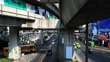 Lower point of view of the bts train in bangkok , thailand. bts is the most important transportation in bangkok. traffic, cars and bridge view
