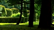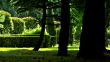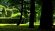 Tranquil shaded public park with tropical plants and trees in resort district in sunny and windy springtime afternoon. Wind movement