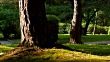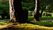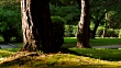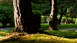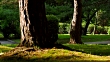 Tranquil shaded public park with tropical plants and trees in resort district in sunny and windy springtime afternoon. Wind movement