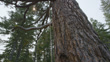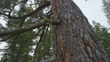Low angle tracking shot up the trunk of a sugar pine tree (Pinus lambertiana) with a climbing rope running up the side and an anonymous climber hoisting themselves up towards the tree canopy, Yosemite, California, USA (FKAD627H - Clip taken from programme rushes - 333938)