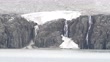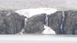water falls over cliffs beneath a glacier in the Svalbard islands
