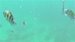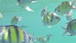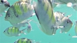 Sergeant Major Damsel fish schooling close to sea surface off Kho Phi Phi island, Thailand.