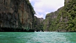 Tropical Paradise, traditional long tailed boats at Maya bay Phi Phi Leh island, Thailand, handheld shot on boat