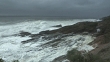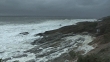 Tropical storm waves crash into the rocky coastline at Beavertail State Park in Jamestown, Rhode Island.
