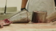 Steady shot of a butcher cutting chunks of albacore tuna, also known as longfin tuna, at a tuna processing plant in Catania, Sicily, Italy.