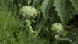 Steady, medium close up shot of two artichoke plants growing in a garden.