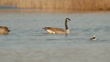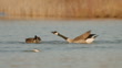 Two Canada Geese, Branta canadensis, swims on the blue water of a Michigan pond. The birds display forms of behavior including verbalizations and aggressive actions. There is also a duck, hooded merganser in the scene.