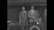 LS two-car motorcade with Pres. Franklin Roosevelt riding in open top car onto drought-ravaged farmer's field / LS cows in pasture / MS horse in pasture / dry, lifeless field of sun-scorched crops / MS of Roosevelt in car / CU Roosevelt talks to farmer / LS crowds and Roosevelt's train at station in Bismark, ND, during whistle stop tour / MS Roosevelt delivers speech while standing with help of hidden brace, arm in arm with son Franklin Roosevelt Jr for balance / cutaway to crowd under "BISMARK" sign / cut back to MS Roosevelt and son in rear of train / LS Kansas Governor Alf Landon, Republican nominee for President, riding in open top car in parade thru downtown Topeka / LS Landon waves hat at enthusiastic crowd from train during whistle stop tour / VS Landon speaks, gladhands, waves hat to crowds on campaign trail, including stop at Lincoln's Tomb in Springfield, IL / LS Landon waves from stage / LS crowd / MS Landon speaks from podium in Buffalo, NY / LS Landon at podium / PAN crowd waves / LS Landon waves to crowd as others on stage rise to their feet and applaud / Note: exact day not known