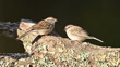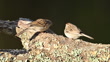 Two chipping sparrows feeding on a dead fallen log in the North Carolina woods.