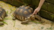 Front view of two golden tortoises with Asian child hands holding tortoise shell.