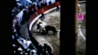 Two matadors taunting the bull with pink and yellow cloth; one matador wearing white, the other wearing black